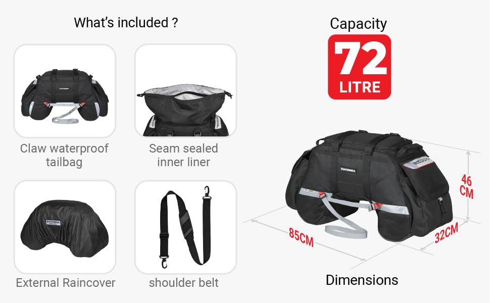 Upgraded 72L Roll-Top Design: The all-weather, 100% waterproof Claw now features a wide roll-top opening, offering ample storage for a 2-3 week trip and compatibility with almost all motorcycle models